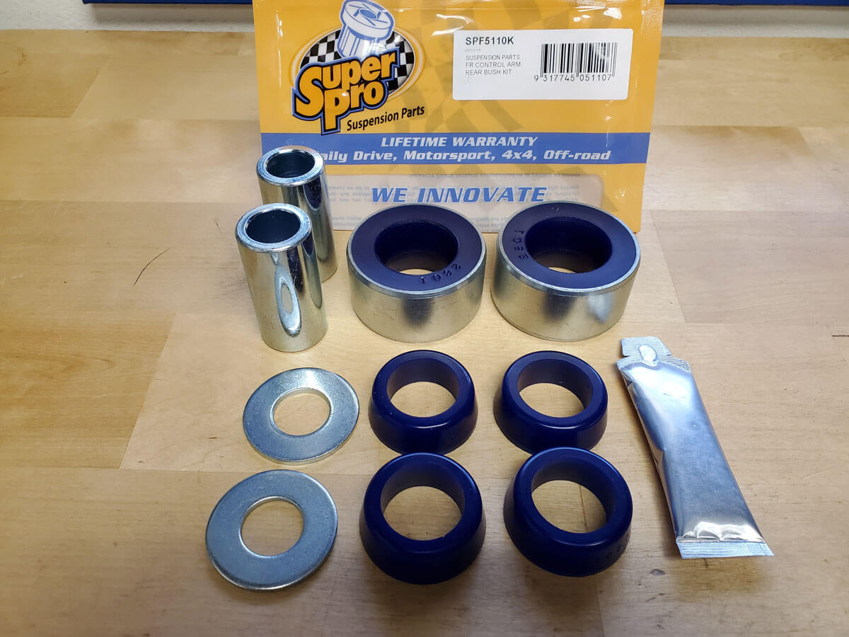 We recently started using a new company for Performance Suspension bushings, control arms etc. called SuperPro. They are manufactured in Australia and have solid North American distribution. I put a set of these bushings in our Forester and the car handles better, and has stayed quiet. The bushings themselves have a “Limited Lifetime Warranty” from defects. Normal wear over time is to be expected but we strongly feel that they will last much much longer than the stock rubber bushing we replace on the daily at the shop.