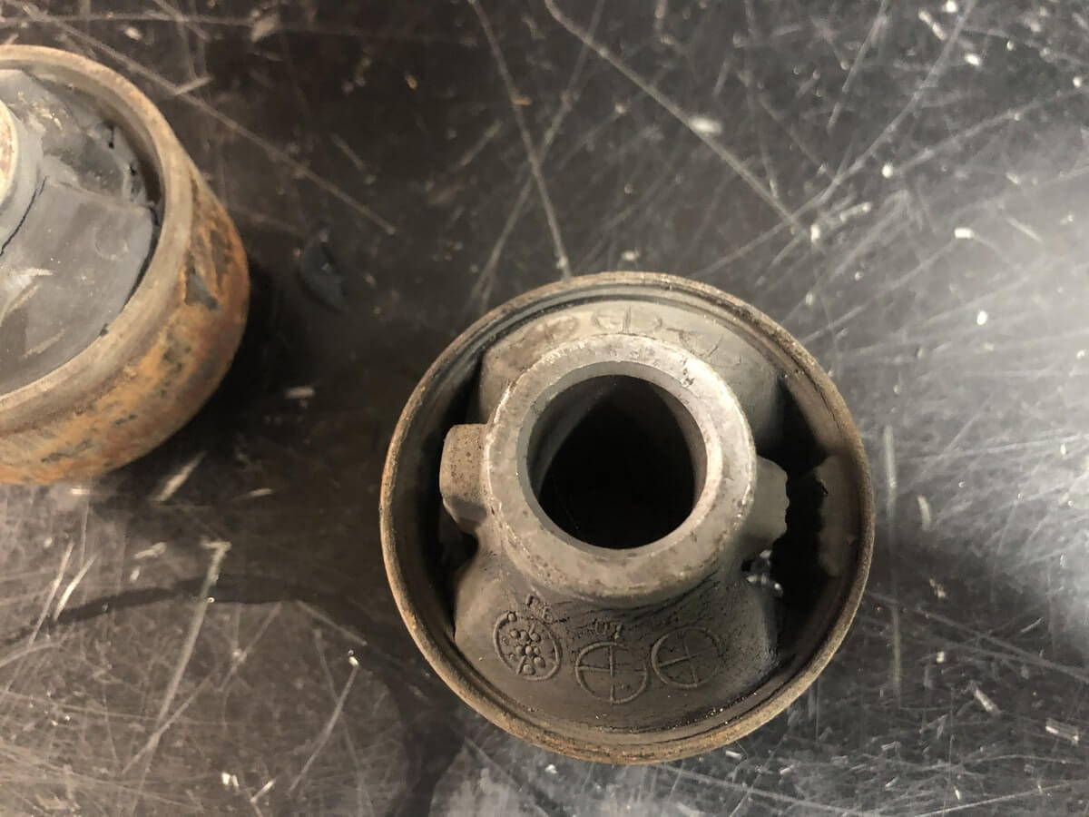 Due to the design there is a lot of stress placed on the rear position bushing in the 2005 and newer design and its not common to see them torn more than 50% as early as 60,000 miles. As the rest of the suspension ages more stress is placed on this pressure point and even a replacement bushing from Subaru may not last as long as the first ones did.